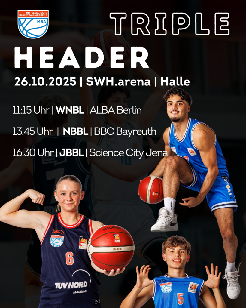 Wer einen Blick in die Zukunft des mitteldeutschen Basketballs werfen möchte, ist am Sonntag in der SWH.arena in Halle bestens aufgehoben. Alle drei Teams der Mitteldeutschen Basketball Academy (MBA) aus den Nachwuchs-Bundesligen präsentieren sich in Heimspielen gegen hochkarätige Gegner.